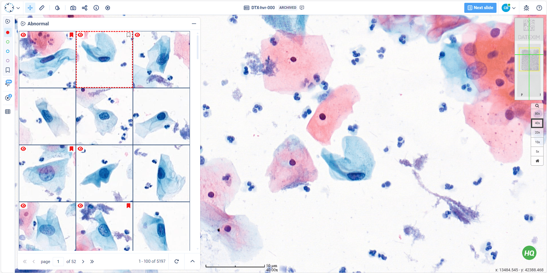 CytoProcessor® puts the most abnormal nuclei first, in the abnormal gallery with a 40x magnification, for quickly making a diagnosis.