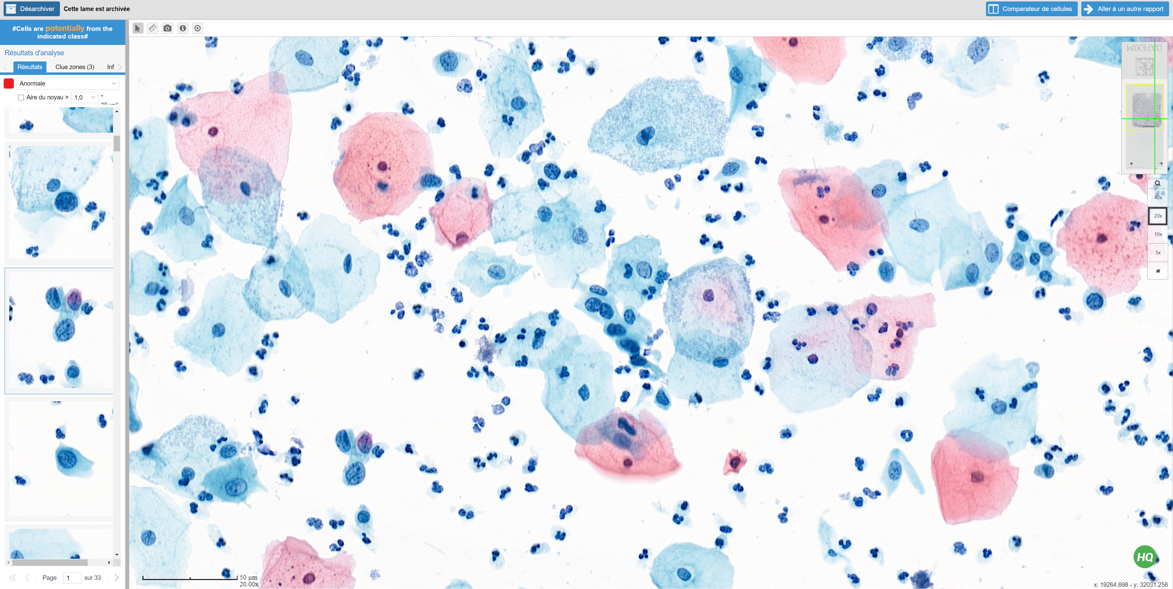 After scanning a slide, CytoProcessor® analyzes all detected nuclei, on the whole slide, using up to 224 visual features computed for each nucleus. The AI uses these data to categorize the cells as abnormal or normal. The abnormal ones are then displayed in a gallery sorted by relevance for the diagnosis.