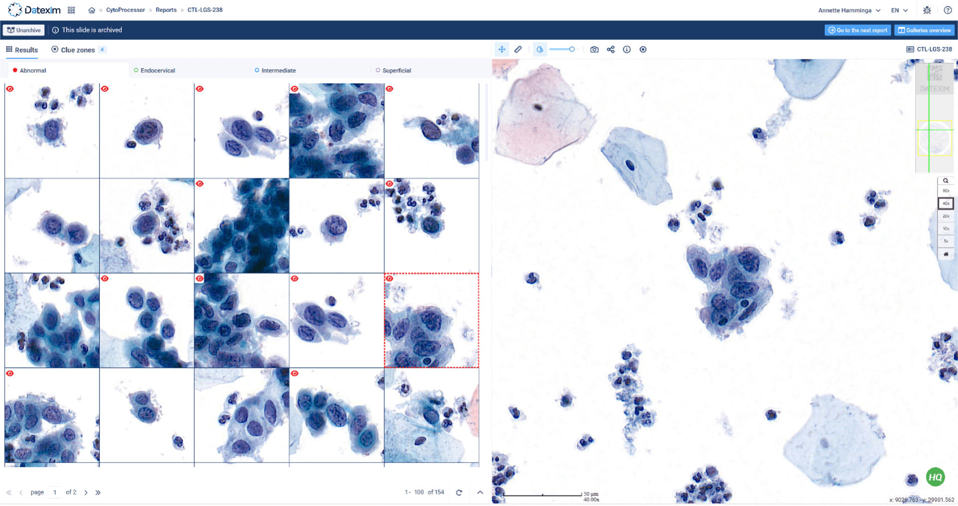 CytoProcessor aids the screener by showing on the first page of the abnormal gallery appropriate to the diagnosis of HSIL-EGI the commonly present: